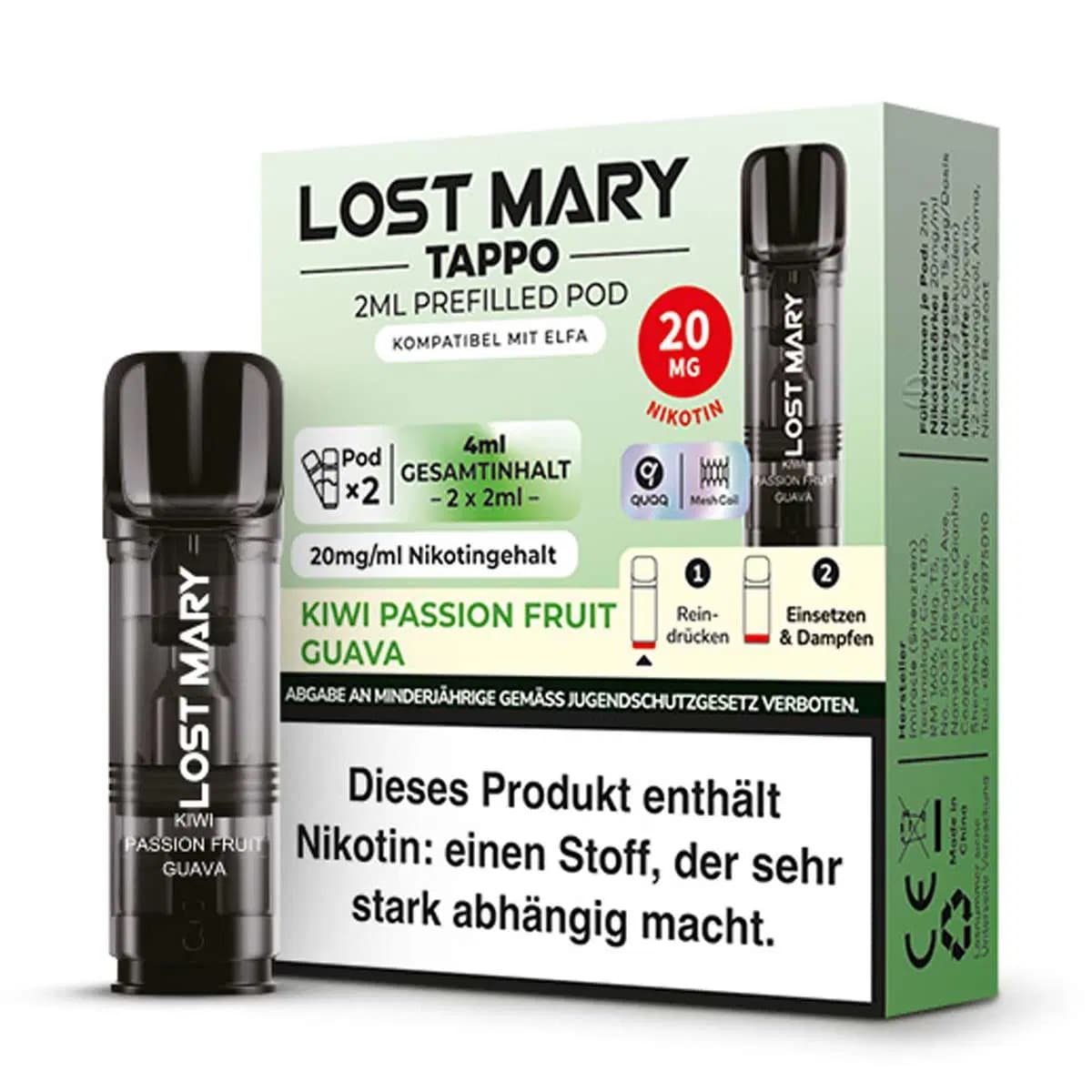 Die Lost Mary Tappo Pods sind vorbefüllte Wechselkartuschen, die speziell für das Lost Mary Tappo System entwickelt wurden. Jede Pod-Kartusche enthält 2 ml hochwertiges Nikotinsalz-Liquid mit einem Nikotingehalt von 2% (20mg/ml) und sorgt für ein intensives Geschmackserlebnis sowie ein besonders sanftes Zuggefühl. Dank der praktischen Plug-and-Play-Funktion lassen sich die Pods schnell und sauber austauschen – ganz ohne Nachfüllen oder Auslaufen. Die Tappo Pods sind in einer Vielzahl beliebter Lost-Mary-Geschmacksrichtungen erhältlich und auch mit ELFA-Geräten kompatibel.